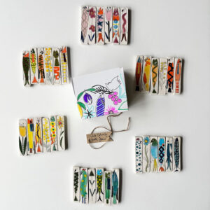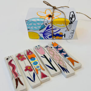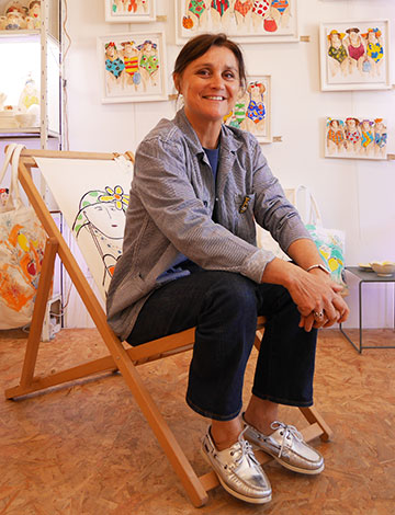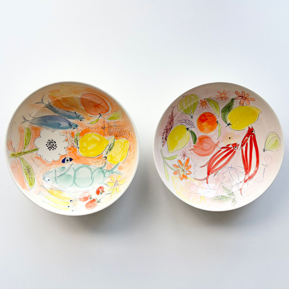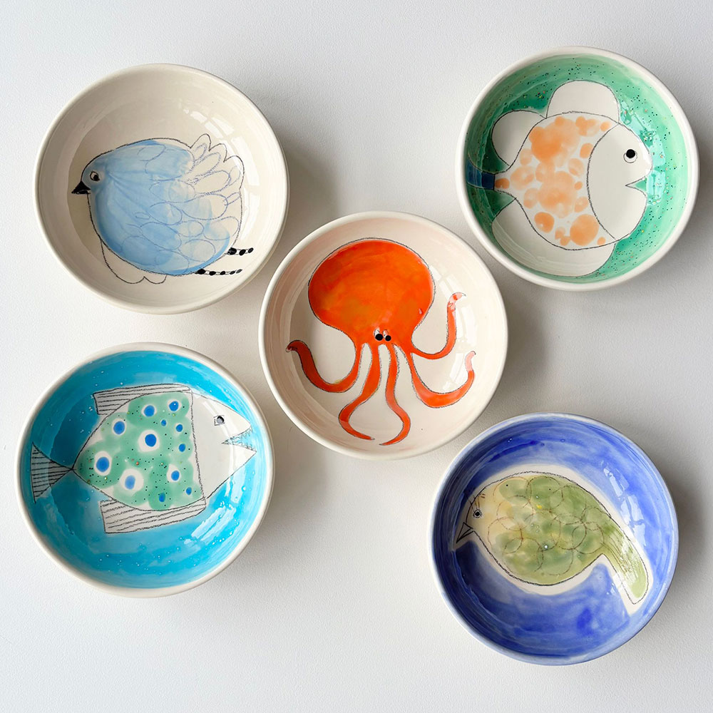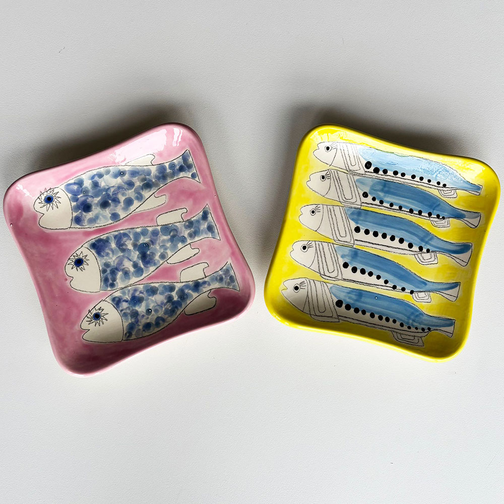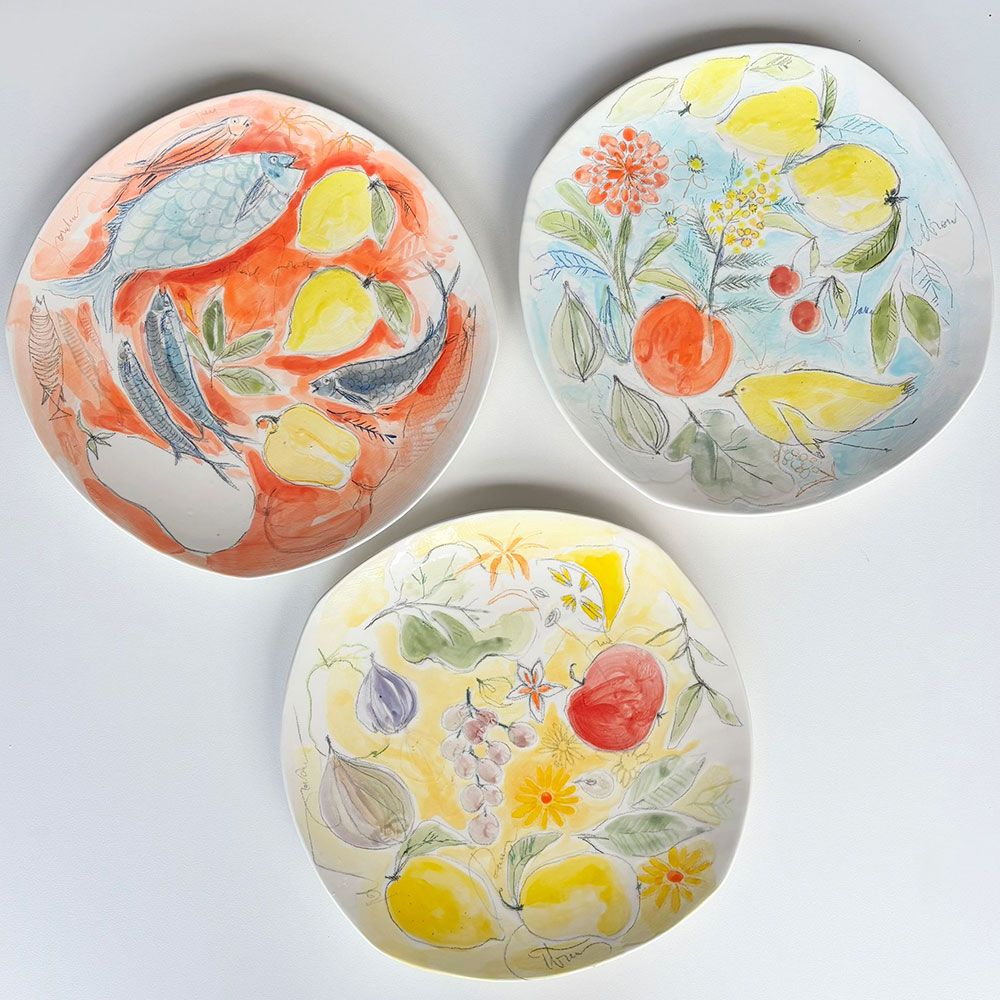 Cet univers, elle le décline également sur des objets plus usuels. Elle peint sur des coussins, des voiles de bateaux, des sacs. Elle s’est tout naturellement tournée vers un nouveau matériau : la céramique. Ses créations de plats, bols et sculptures représentant des poissons, fruits, baigneuses rencontrent un vif succès. Ses « Baigneuses » d’ailleurs, désormais iconiques, se déclinent sur des toiles de différents formats et supports.