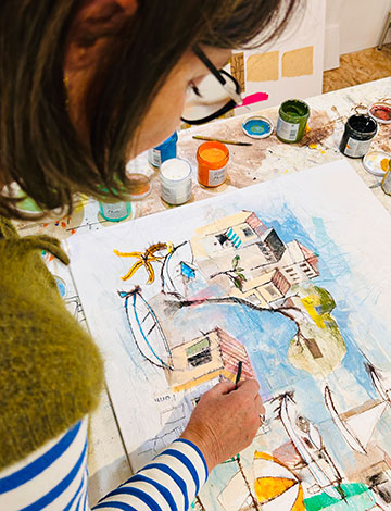 Toutes ces matières donnent à ses peintures une atmosphère de fantaisie et de légèreté. Très inspirée par la méditerranée, Cécile prend des photos de détails, de balcons, de fruits, de pierres et végétaux qu’elle mélange dans ses peintures pour retranscrire l’atmosphère d’un lieu. La suggestion, la matière, le détail qui semble anodin révèlent un univers pictural très inspiré qui nous offre des instants magiques.