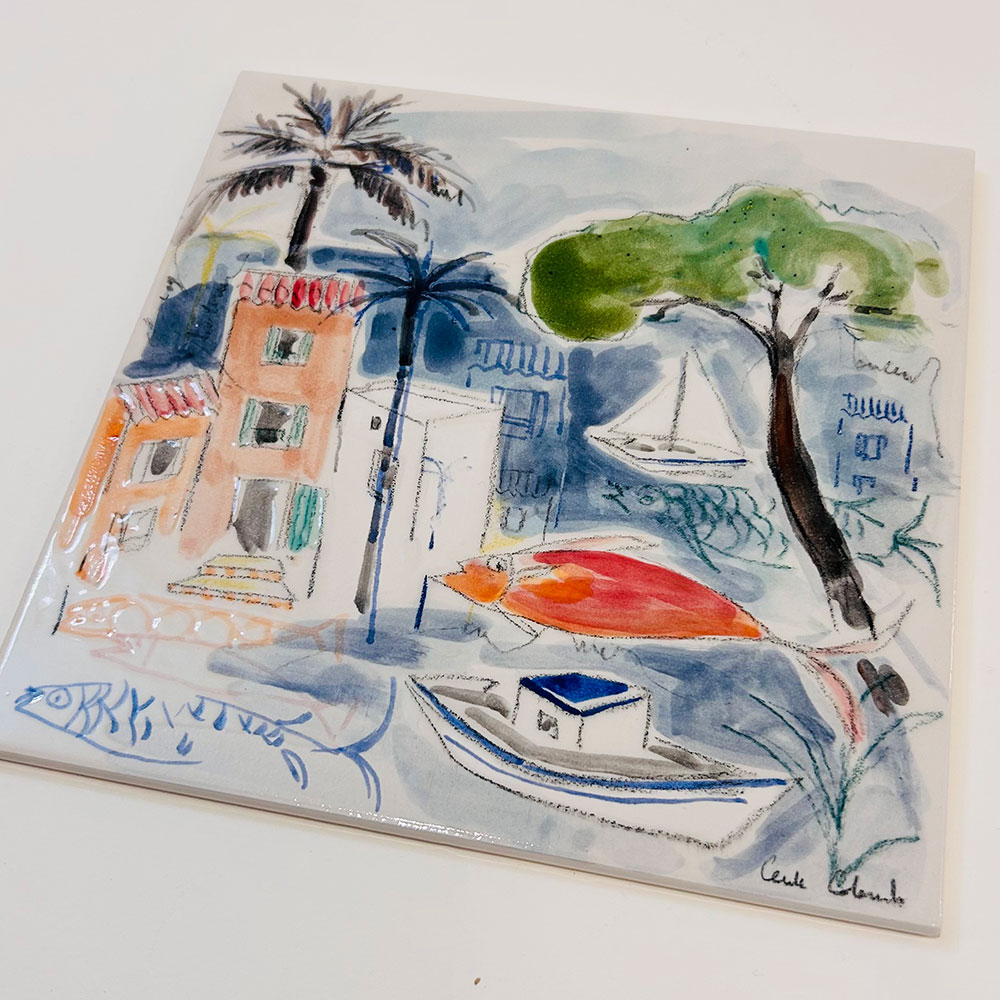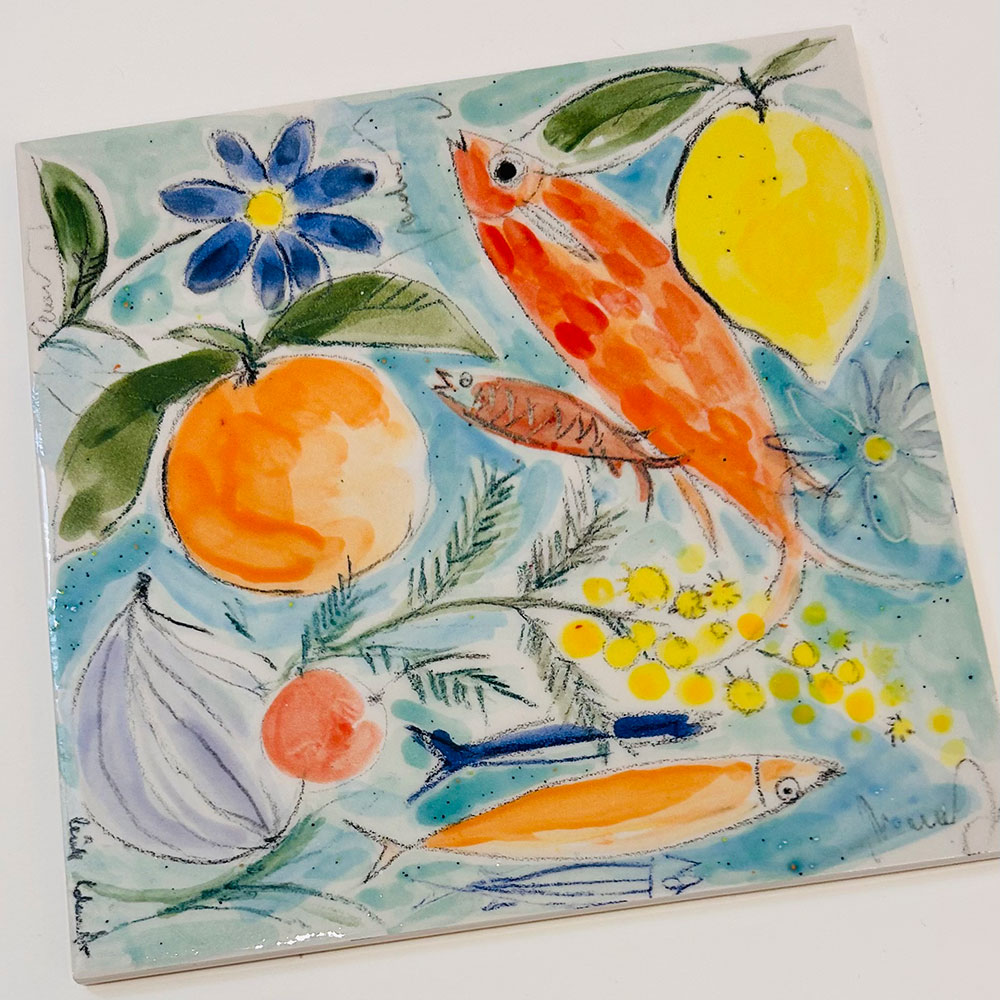 | Motifs | Bleu ciel fruits poissons mimosa, Paysage méditerranéen, Poisson jaune et noir |